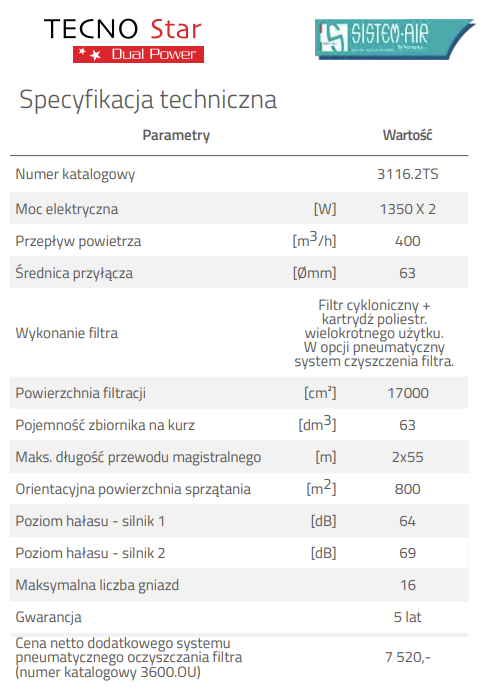 • Dwie turbiny pozwalające na uzyskanie przepływu powietrza niezbędnego do jednoczesnego odkurzania przez dwóch użytkowników. Łączna moc elektryczna 2,7 kW.