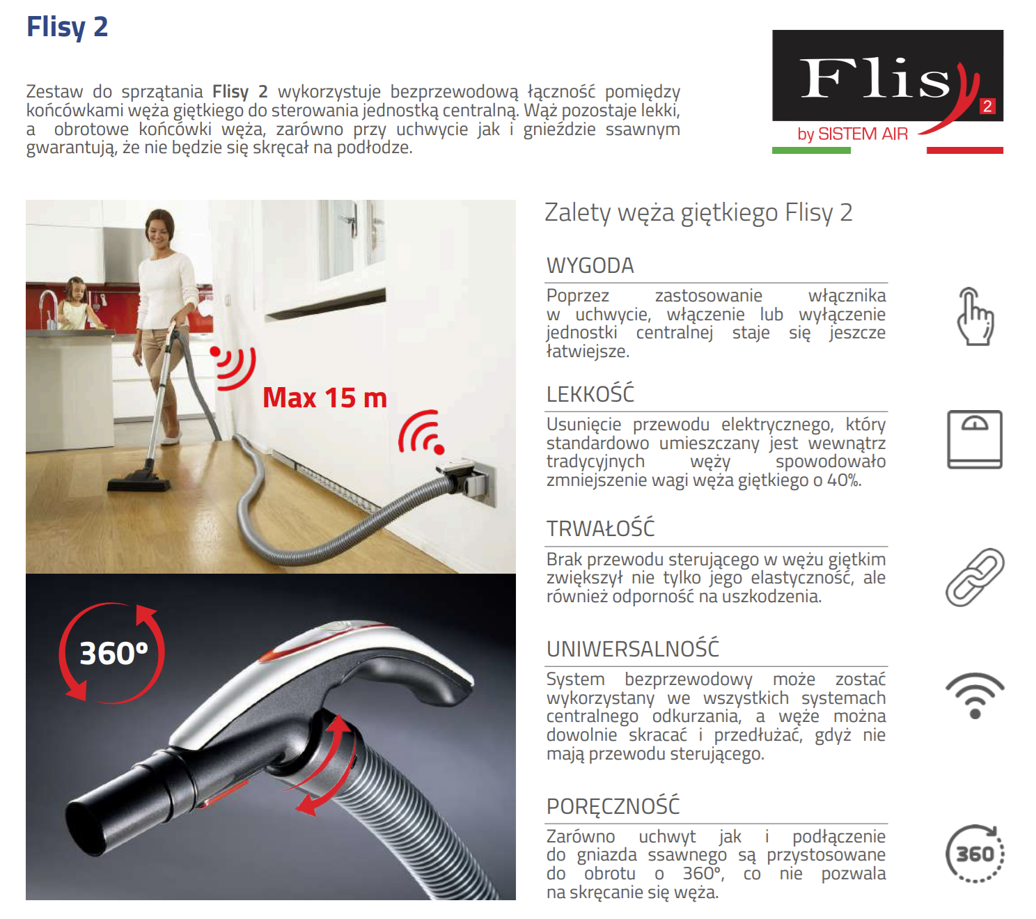 W nowym Flisy2 zaprojektowano do współpracy z dowolnym centralnym systemem odkurzania, w którym znajduje się linia mikroprzełączników łącząca gniazda ssące. Dotyczy to wszystkich systemów na świecie, bez problemów z zasilaniem panelu sterowania lub napięciem występującym na linii mikroprzełącznika.